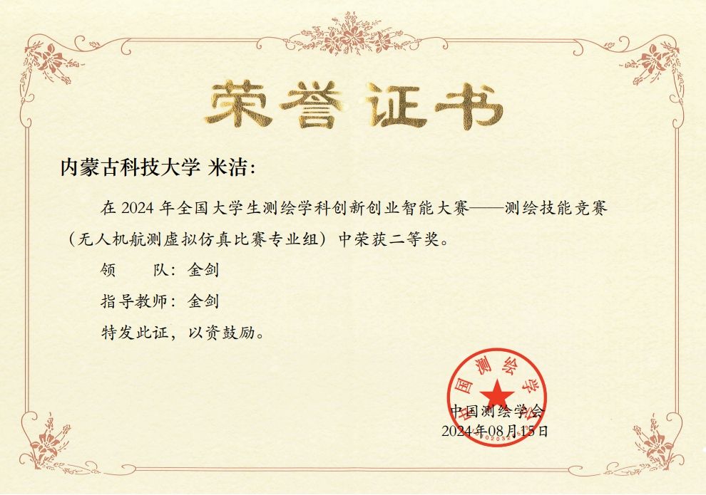 bv伟德官网测绘工程系学子经过积极选拔与备战,参与了大赛各个项目的激烈角逐。最终,在金剑老师的指导下,bv伟德官网优秀学子米洁从来自全国360所高校的近8000名学生中脱颖而出,获得无人机航测虚拟仿真比赛的全国二等奖。