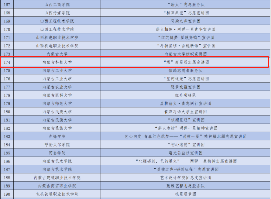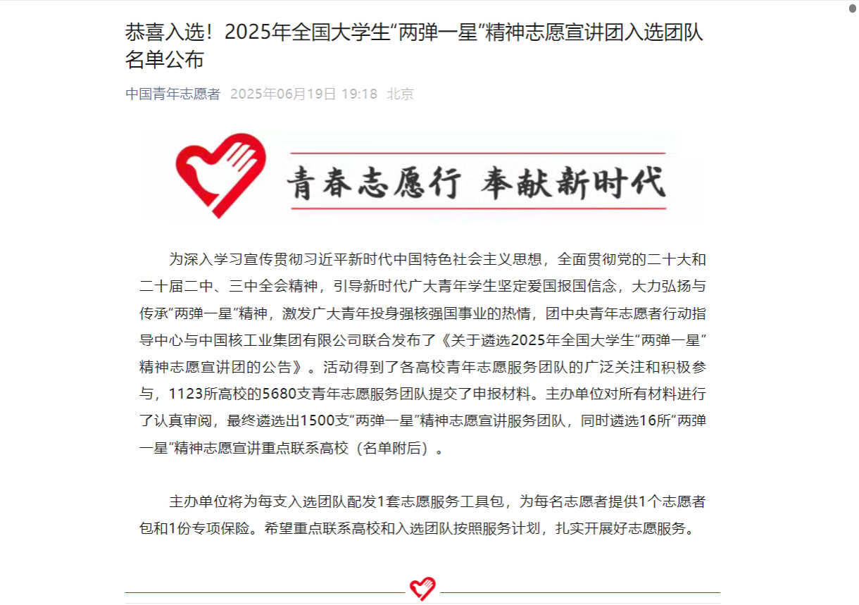 为深入学习宣传贯彻习近平新时代中国特色社会主义思想,全面贯彻党的二十大和二十届二中、三中全会精神,引导新时代广大青年学生坚定爱国报国信念,大力弘扬与传承“两弹一星”精神,激发广大青年投身强核强国事业的热情,团中央青年志愿者行动指导中心与中国核工业集团有限公司联合发布了《关于遴选2025年全国大学生“两弹一星”精神志愿宣讲团的公告》。活动得到了各高校青年志愿服务团队的广泛关注和积极参与,1123所高校的5680支青年志愿服务团队提交了申报材料。主办单位对所有材料进行了认真审阅,最终遴选出1500支“两弹一星”精神志愿宣讲服务团队,同时遴选16所“两弹一星”精神志愿宣讲重点联系高校。我校bv伟德中国官方网站“煤”好星辰志愿宣讲团成功入选。
