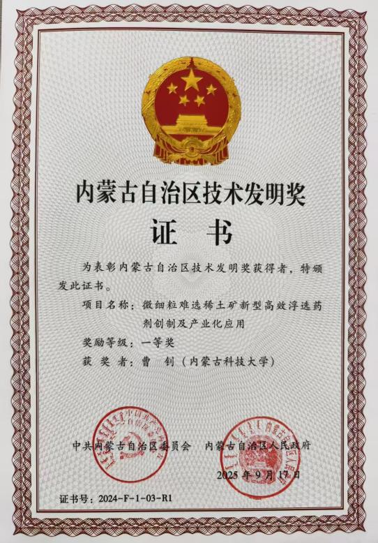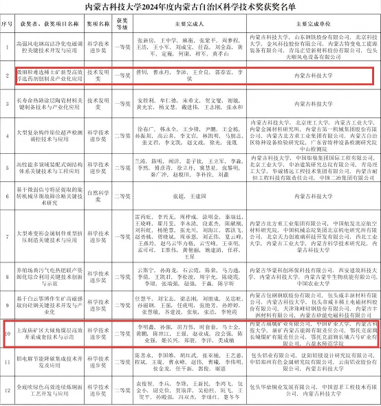 11月27日,2024年度内蒙古自治区科学技术奖励大会在呼和浩特市召开,表彰为全区科技进步和高质量发展作出突出贡献的科技工作者。大会公布了2024年度自治区科学技术奖获奖名单,bv伟德官网教师参与的多项成果荣获自治区科学技术奖,曹钊教授团队的“微细粒难选稀土矿新型高效浮选药剂创制及产业化应用”获得技术发明奖一等奖,段会强老师参与“上海庙矿区大倾角煤层高效开采成套技术与示范”获得科学技术进步二等奖。
