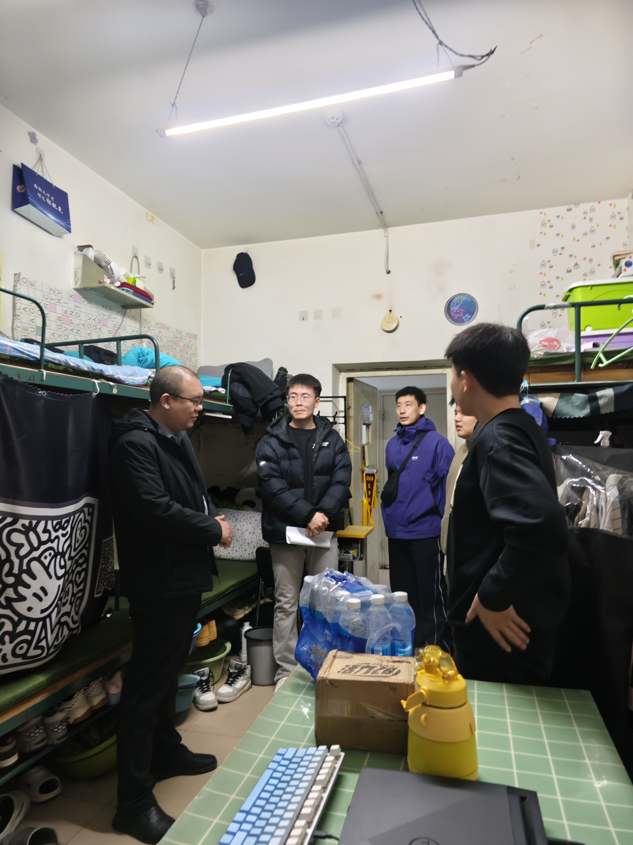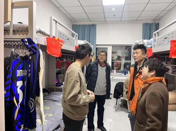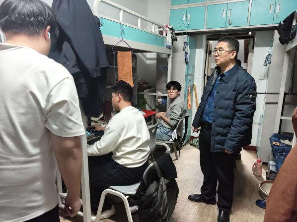 随后,学院五位领导带队深入学生宿舍开展实地检查。院领导一行仔细查看宿舍环境卫生、安全用电、物品摆放等情况,与同学们亲切交流,详细了解大家的学习生活状态,对发现的问题现场提出整改意见,强调要牢固树立安全意识,共同营造整洁、文明、安全的宿舍环境。