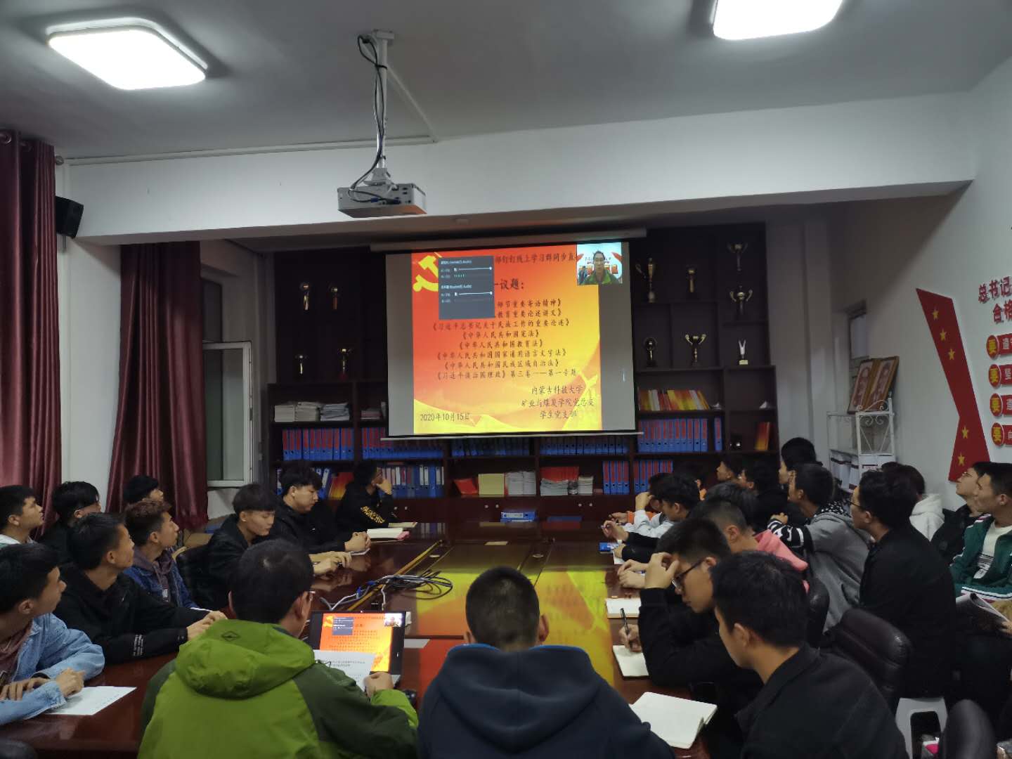 为进一步提高学生爱国主义观念和思想觉悟,矿业与煤炭学院党总支于2020年10月15日晚上19:30,在临曦楼二楼党员之家线上线下同步开展专题理论学习活动。本次学习内容是第一议题:《习近平总书记关于民族工作的重要论述》、《习近平谈治国理政》第三卷《习近平总书记教师节重要寄语精神》、《习近平总书记教育重要论述讲义》;专题理论:《中华人民共和国宪法》《中华人民共和国教育法》、《中华人民共和国国家通用语言文字法》、《中华人民共和国民族区域自治法》;爱国主义教育专题:观看《红色之子乌兰夫(上)》