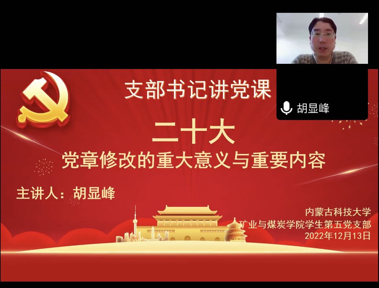 为引导广大党员深入学习贯彻党的二十大精神,更加自觉地学习党章、遵守党章、贯彻党章、维护党章,bv伟德中国官方网站学生第五党支部于2022年12月13日组织开展支部书记讲党课,党课由支部书记胡显峰主讲,支部全体党员参加学习,本次学习利用腾讯会议线上开展。
