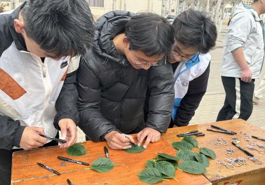 本次活动准备为同学们准备了大量栩栩如生的假树叶和色彩丰富的马克笔。同学们热情高涨,纷纷拿起笔,在树叶上认真书写。有的同学写下自己的名字,希望在这场与自然的约会中留下专属印记;有的同学则倾诉着对大自然的赞美,“每一片树叶都是自然的诗篇,愿我们永远守护这份美好”。