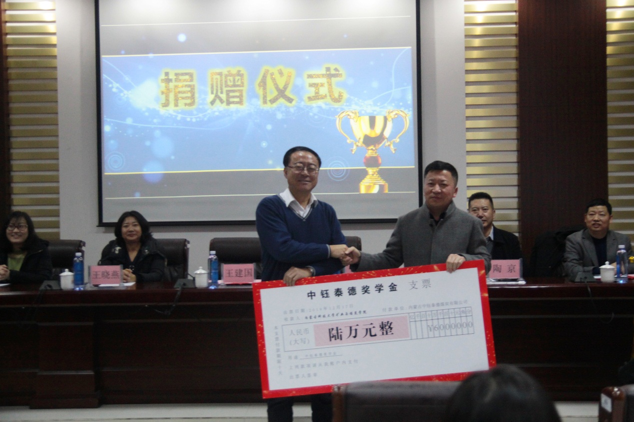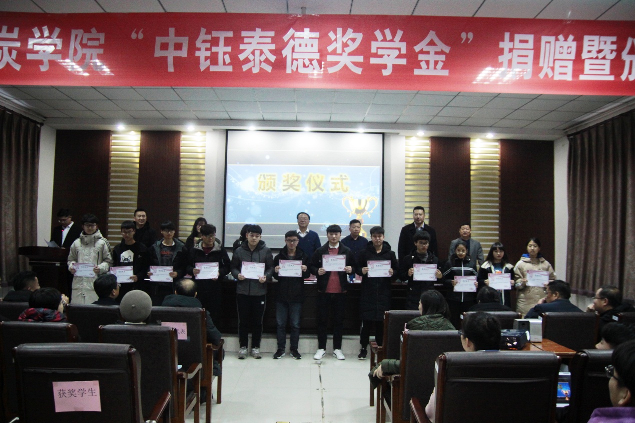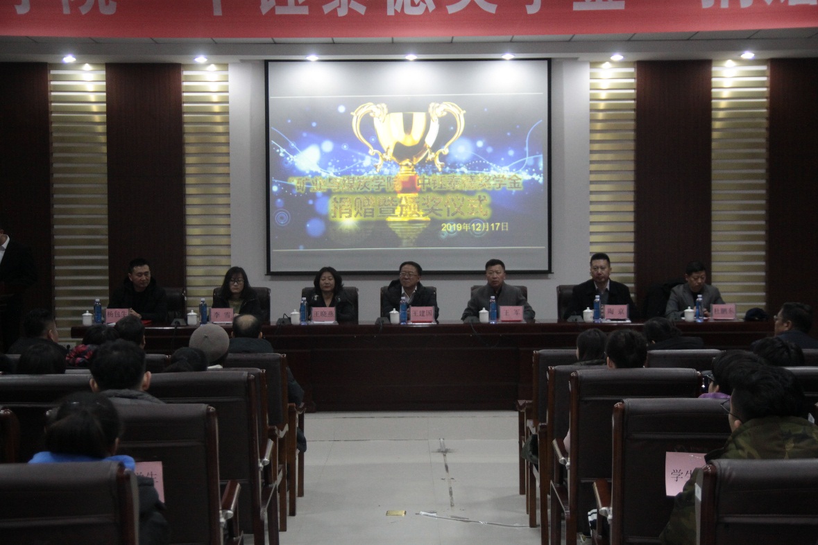 2019年12月17日下午16:30,bv伟德中国官方网站在实验实训楼会议室举行了“中钰泰德奖学金”捐赠暨颁奖仪式。出席本次会议的领导有:内蒙古中钰泰德煤炭有限公司董事长兼总经理王军、副总经济师王晓燕、人力资源部经理陶京、人力资源部社保主管李雪;bv伟德中国官方网站党总支书记王建国、副书记副院长杜鹏东、副院长杨包生、各系部主任,以及辅导员。