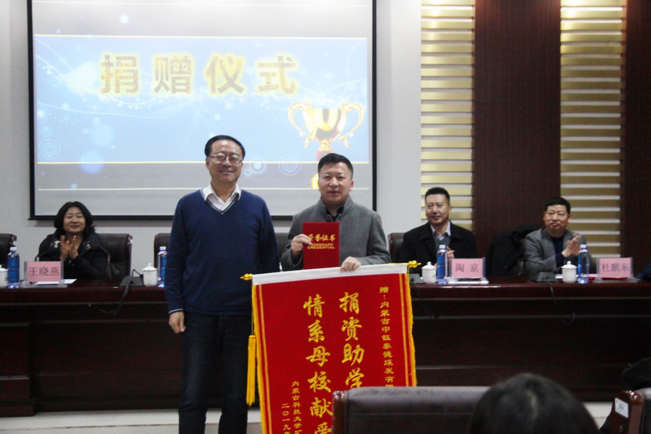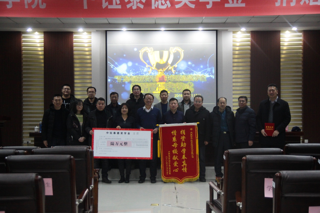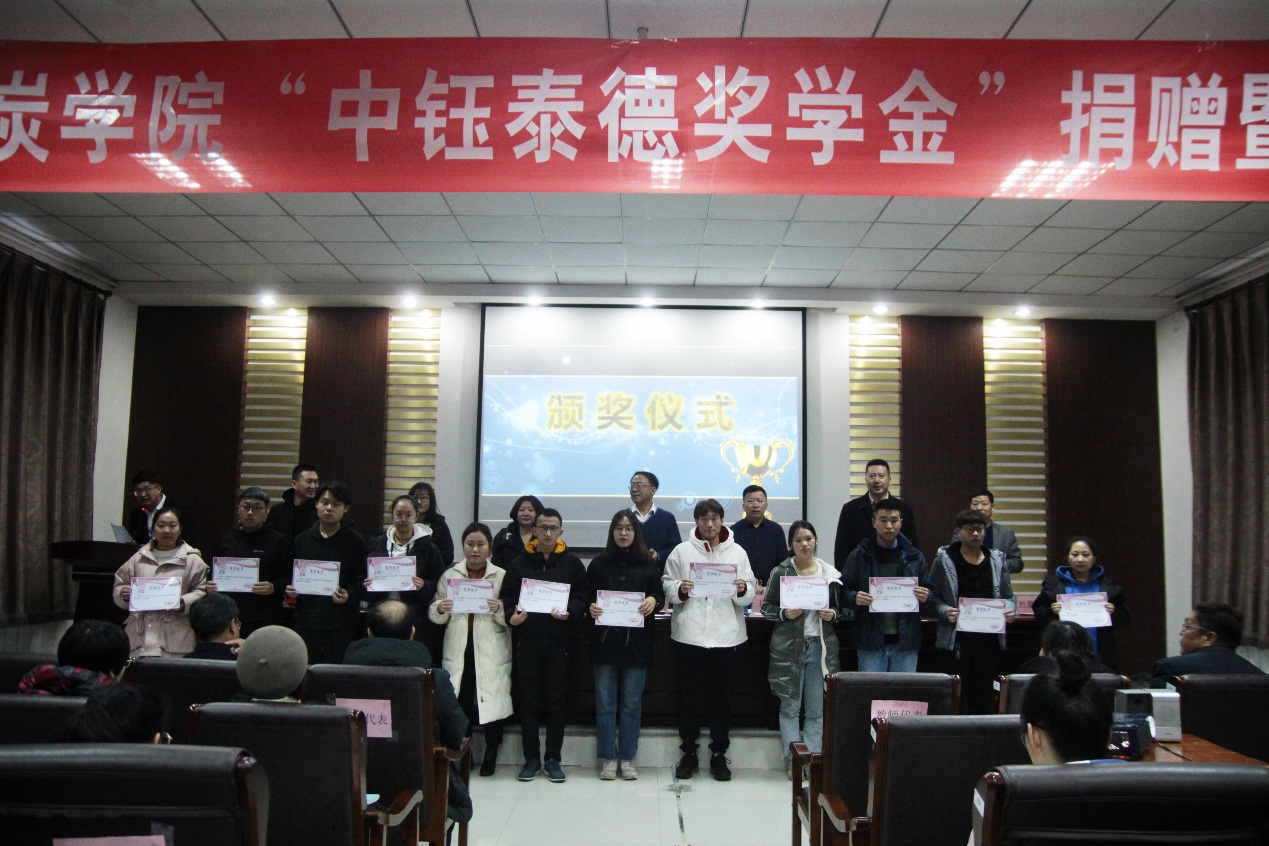 2019年12月17日下午16:30,bv伟德中国官方网站在实验实训楼会议室举行了“中钰泰德奖学金”捐赠暨颁奖仪式。出席本次会议的领导有:内蒙古中钰泰德煤炭有限公司董事长兼总经理王军、副总经济师王晓燕、人力资源部经理陶京、人力资源部社保主管李雪;bv伟德中国官方网站党总支书记王建国、副书记副院长杜鹏东、副院长杨包生、各系部主任,以及辅导员。